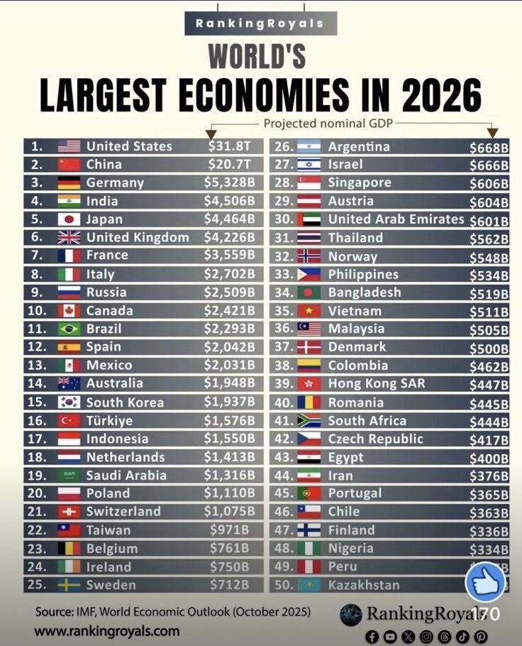 Sjedinjene Američke Države zadržavaju poziciju najveće svjetske ekonomije s projiciranim BDP-om od 31,8 triliona dolara u 2026. — više nego sljedeće dvije zemlje zajedno.