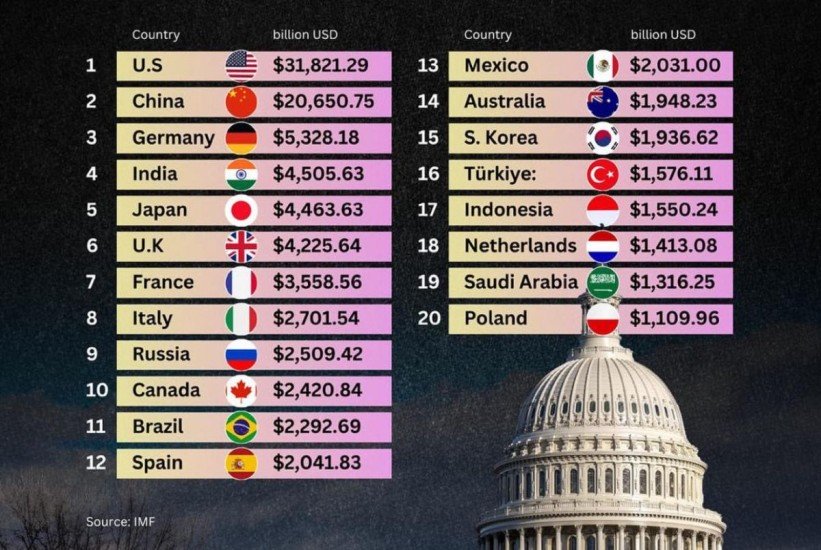 Kina je na 20,7 triliona dolara, a Njemačka na 5,3 triliona. Razlika na vrhu je ogromna. Ali prava priča nije ko pobjeđuje, nego ko napreduje.